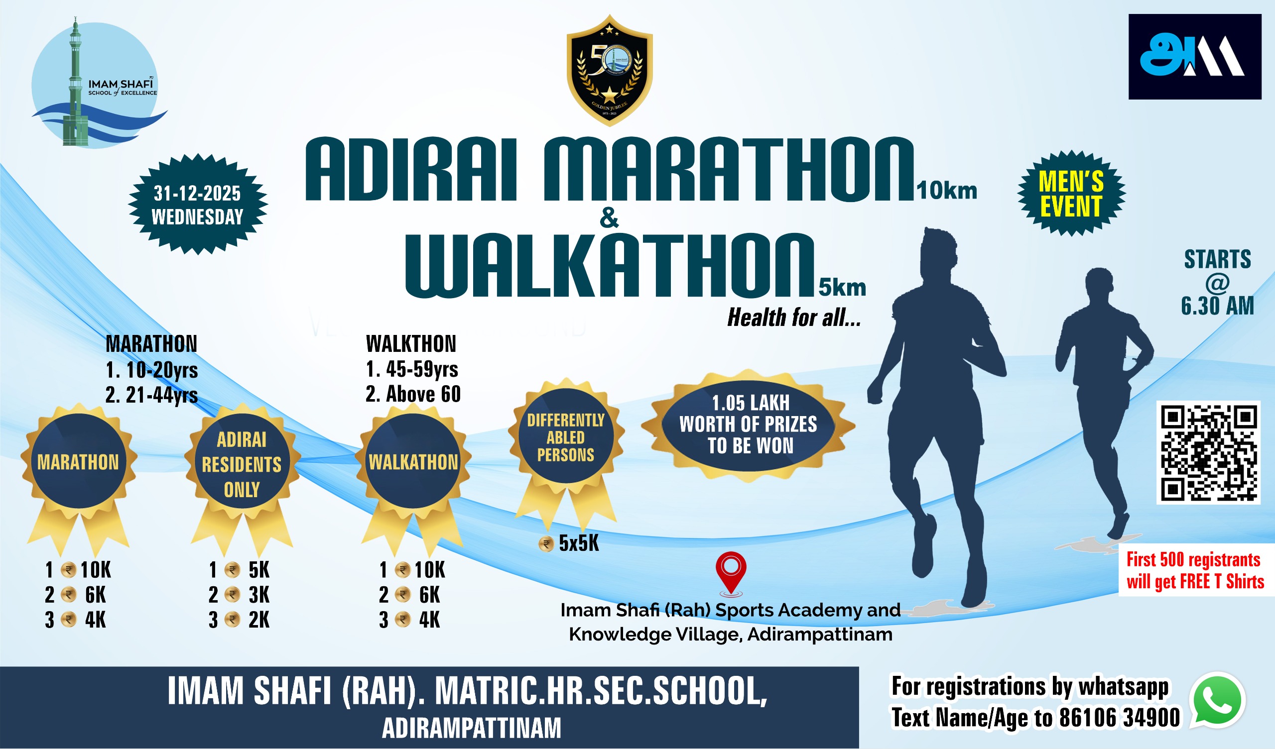 We are thrilled to announce the Adirai Marathon and Walkathon organized by Imam Shafi (Rah) Matriculation Higher Secondary School! Registration is now OPEN for all participants.